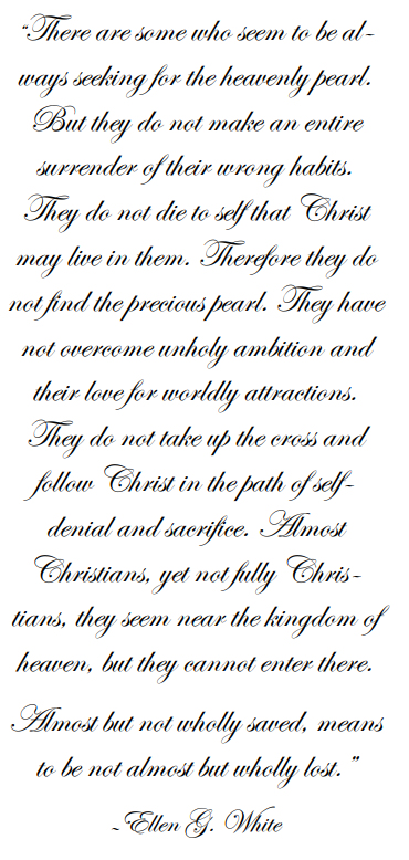Adventists have known of this fact for more than a century, but who are making their robes white in the blood of the Lamb? "I urge upon you the necessity of purity in every thought, in every word, in every action. We have an individual accountability to God, and individual work which no one can do for us." [Mind, Character, and Personality vol. 1, p. 289]